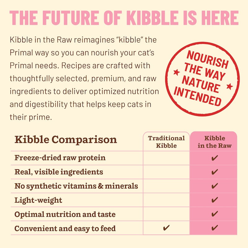 Kibble in the Raw reimagines “kibble” the Primal way so you can nourish your cat’s Primal needs. Our Beef Recipe is made with grass-fed beef and other thoughtfully selected, premium, and raw ingredients. Crafted entirely of freeze-dried bites, this recipe delivers optimized nutrition and digestibility in the same scoop-and-serve feeding experience as kibble - perfect for all feeding routines. It's lighter and more dense than traditional kibble so you get more feedings out of every pound of food.
