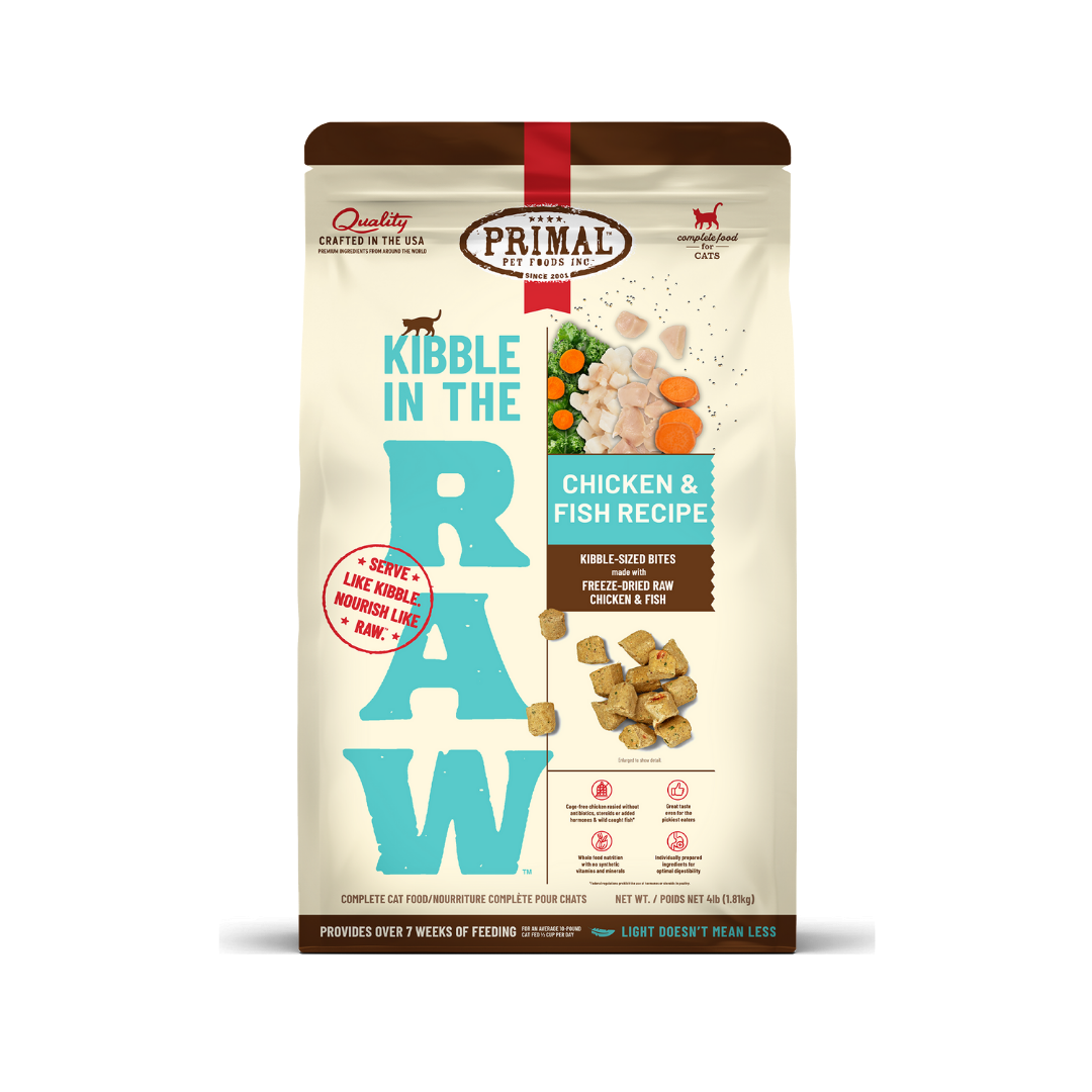 Kibble in the Raw reimagines “kibble” the Primal way so you can nourish your cat’s Primal needs. Our Chicken & Fish recipe is crafted with cage-free chicken raised without antibiotics, steroids, or added hormones and wild caught fish and other thoughtfully selected, premium, and raw ingredients. Crafted entirely of freeze-dried bites, this recipe delivers optimized nutrition and digestibility in the same scoop-and-serve feeding experience as kibble - perfect for all feeding routines. It's lighter and more dense than traditional kibble so you get more feedings out of every pound of food.