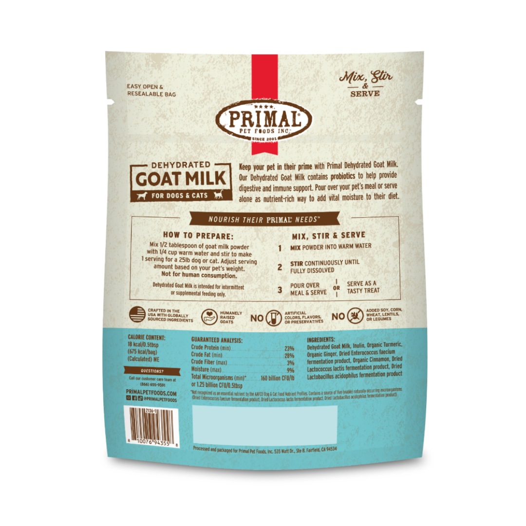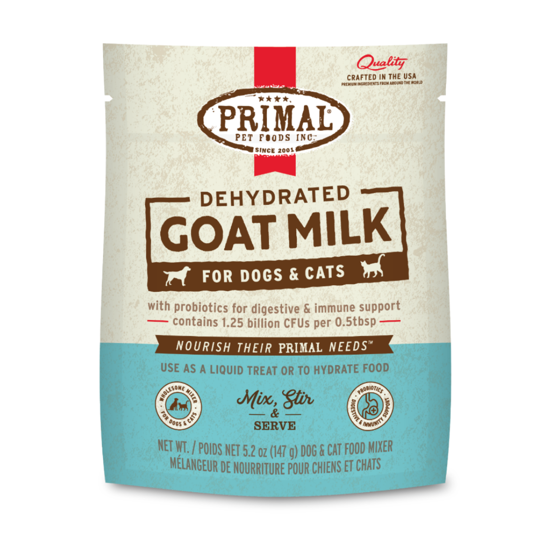Give your pet more time in their prime with Primal Dehydrated Goat Milk. Our recipe contains probiotics that provide digestive and immune support and is sourced from certified humanely raised goats.