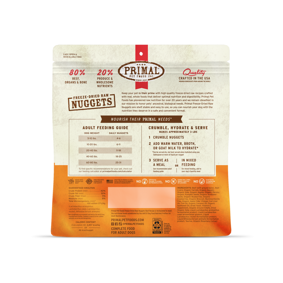 Beef (with ground bone), Beef Livers, Organic Carrots, Organic Squash, Organic Kale, Organic Apples, Organic Parsley, Organic Pumpkin Seeds, Organic Sunflower Seeds, Organic Blueberries, Organic Cranberries, Organic Broccoli, Montmorillonite Clay, Organic Apple Cider Vinegar, Cod Liver Oil, Fish Oil, Organic Coconut Oil, Organic Sunflower Oil, Dried Yeast, Vitamin E Supplement, Organic Ground Alfalfa, Dried Organic Kelp, Liquid Lactobacillus acidophilus fermentation product, Liquid Lactobacillus casei fermentation product, Liquid Lactobacillus reuteri fermentation product, Liquid Bifidobacterium animalis fermentation product, Taurine, Organic Rosemary Extract